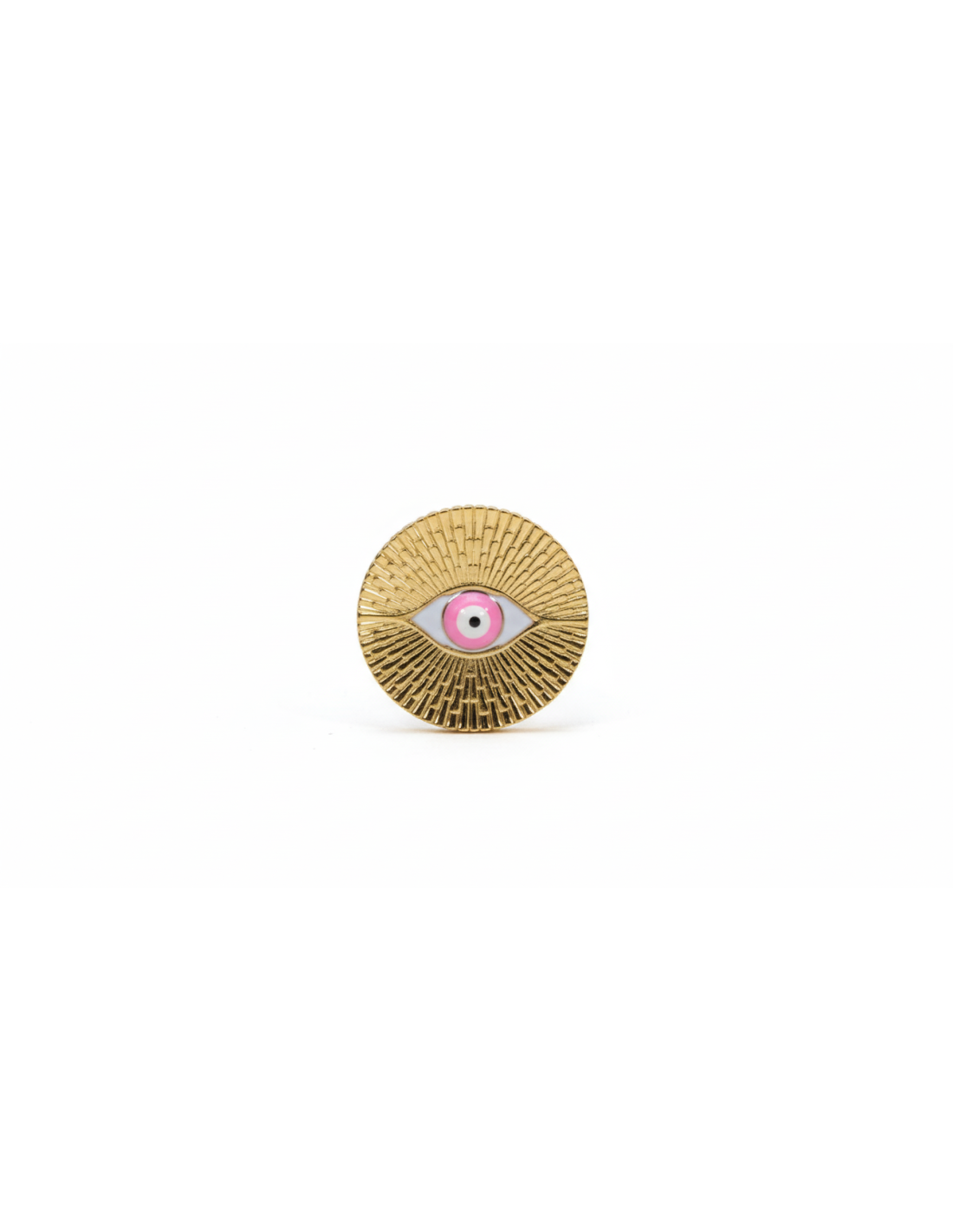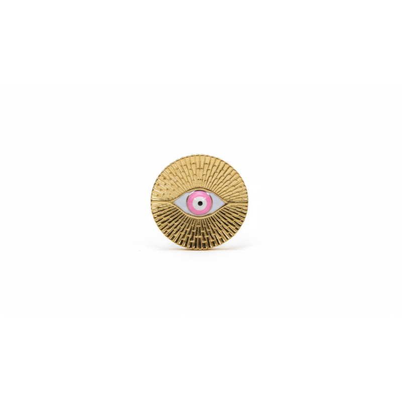 Destaca con este anillo de acero inoxidable único, diseñado con un ojo central en tonos rosa y blanco que simboliza protección, intuición y energía positiva. Su estructura metálica texturizada refleja la luz con un brillo elegante. Fabricado en acero inoxidable, es resistente al desgaste, al agua y al paso del tiempo, ideal para uso diario.