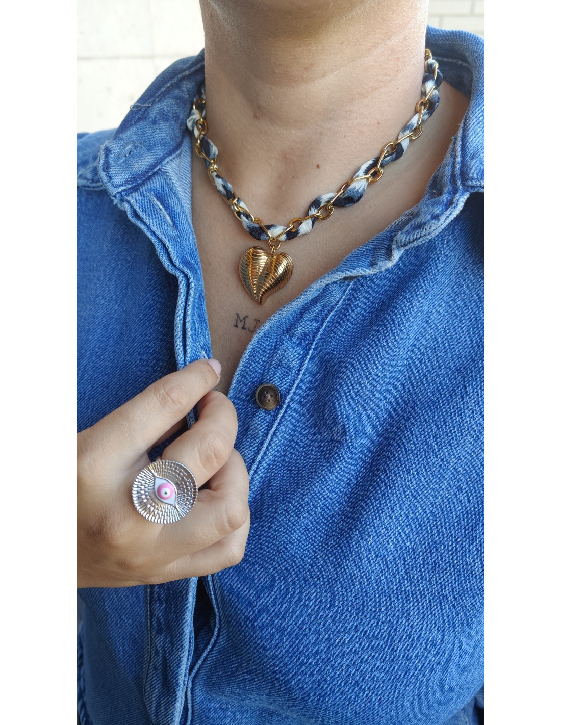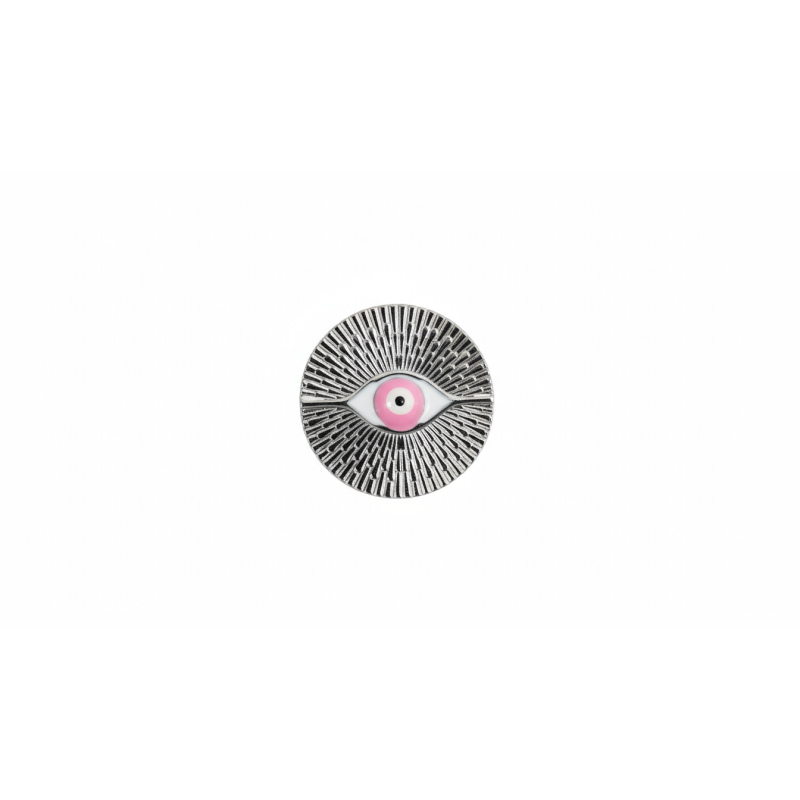 Destaca con este anillo de acero inoxidable único, diseñado con un ojo central en tonos rosa y blanco que simboliza protección, intuición y energía positiva. Su estructura metálica texturizada refleja la luz con un brillo elegante. Fabricado en acero inoxidable, es resistente al desgaste, al agua y al paso del tiempo, ideal para uso diario.