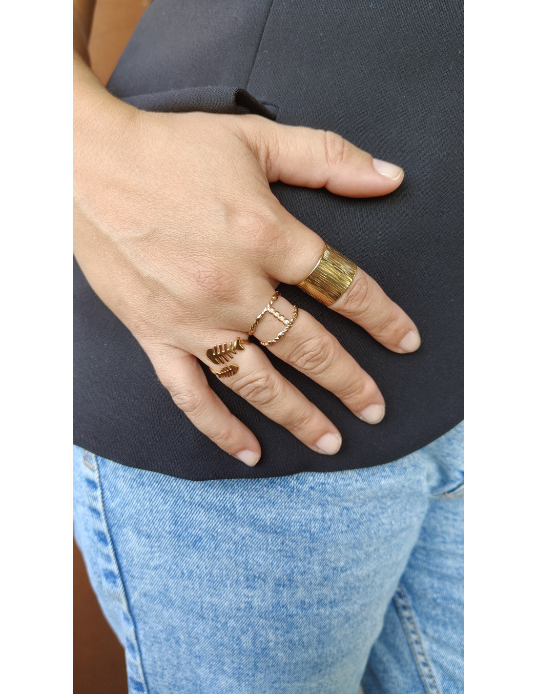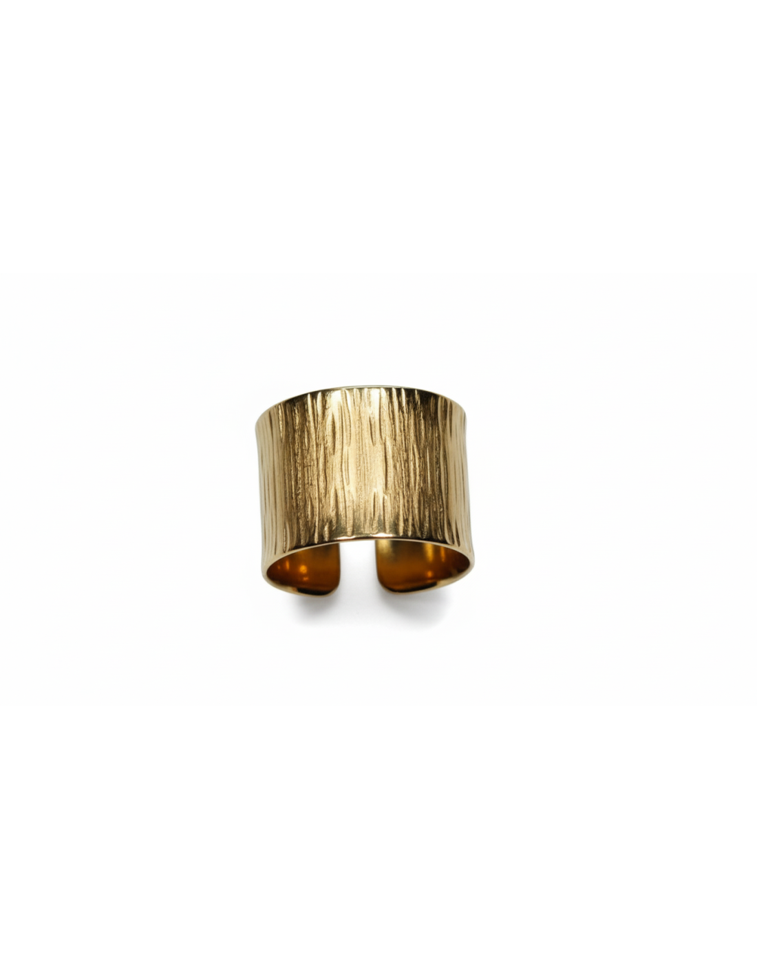 Añade un toque de elegancia atemporal a tu look con este anillo de banda ancha en acabado dorado. Su diseño abierto permite ajustarlo fácilmente a diferentes tallas, convirtiéndolo en una pieza versátil y cómoda para el día a día.