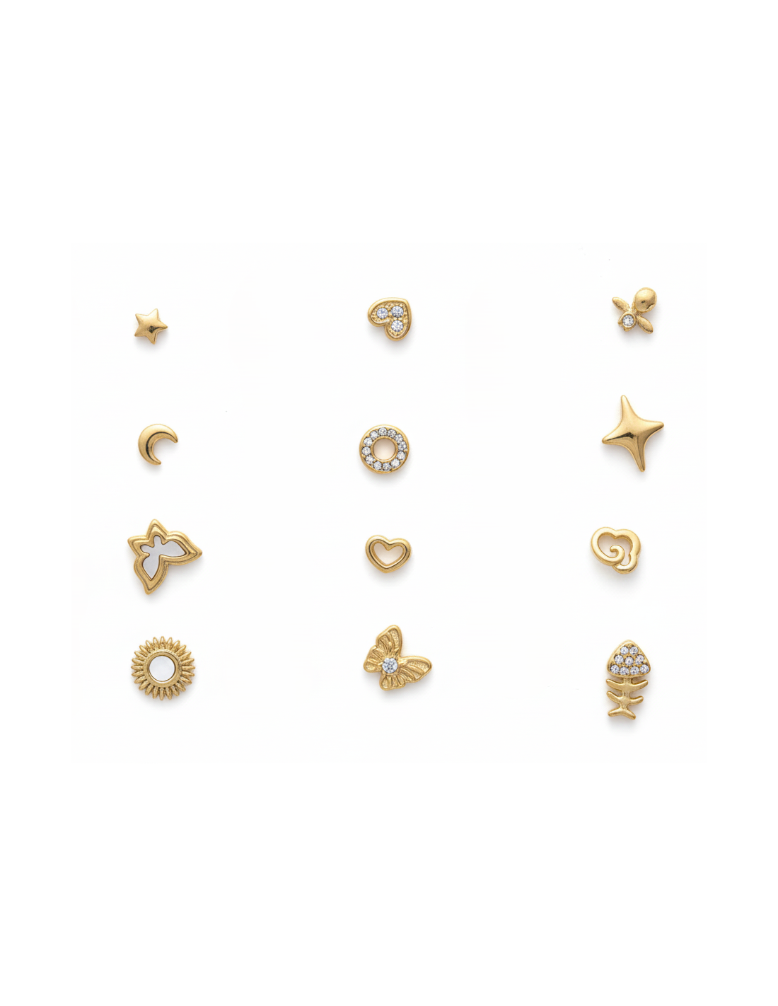 Estos minis pendientes de acero inoxidable es la elección perfecta para darle un toque delicado y sofisticado a tu estilo diario. cada pieza ha sido elaborada con detalle para aportar brillo y personalidad. Resistente al agua y al desgaste, garantiza durabilidad y comodidad para uso diario sin perder su acabado dorado. Ideal para combinar con otros pendientes y crear un look único, minimalista y moderno.