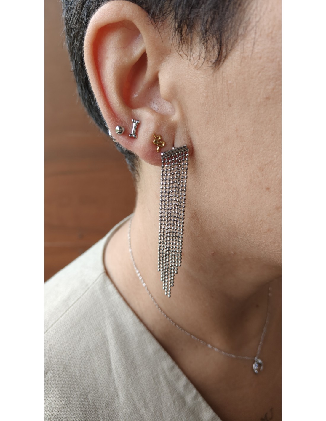 Un pendiente delicado y elegante con diseño de mini serpiente, elaborado con finos detalles que realzan su silueta. Ideal para quienes buscan un accesorio original, con un aire místico y simbólico: la serpiente representa transformación, poder y protección. Su tamaño pequeño lo hace perfecto para usar a diario, solo o combinado con otros pendientes, añadiendo un estilo único y moderno. Fabricado con materiales de calidad, este pendiente es cómodo de llevar y perfecto tanto para el día a día como para ocasiones especiales, convierte este accesorio en mucho más que una joya: es una declaración de estilo.