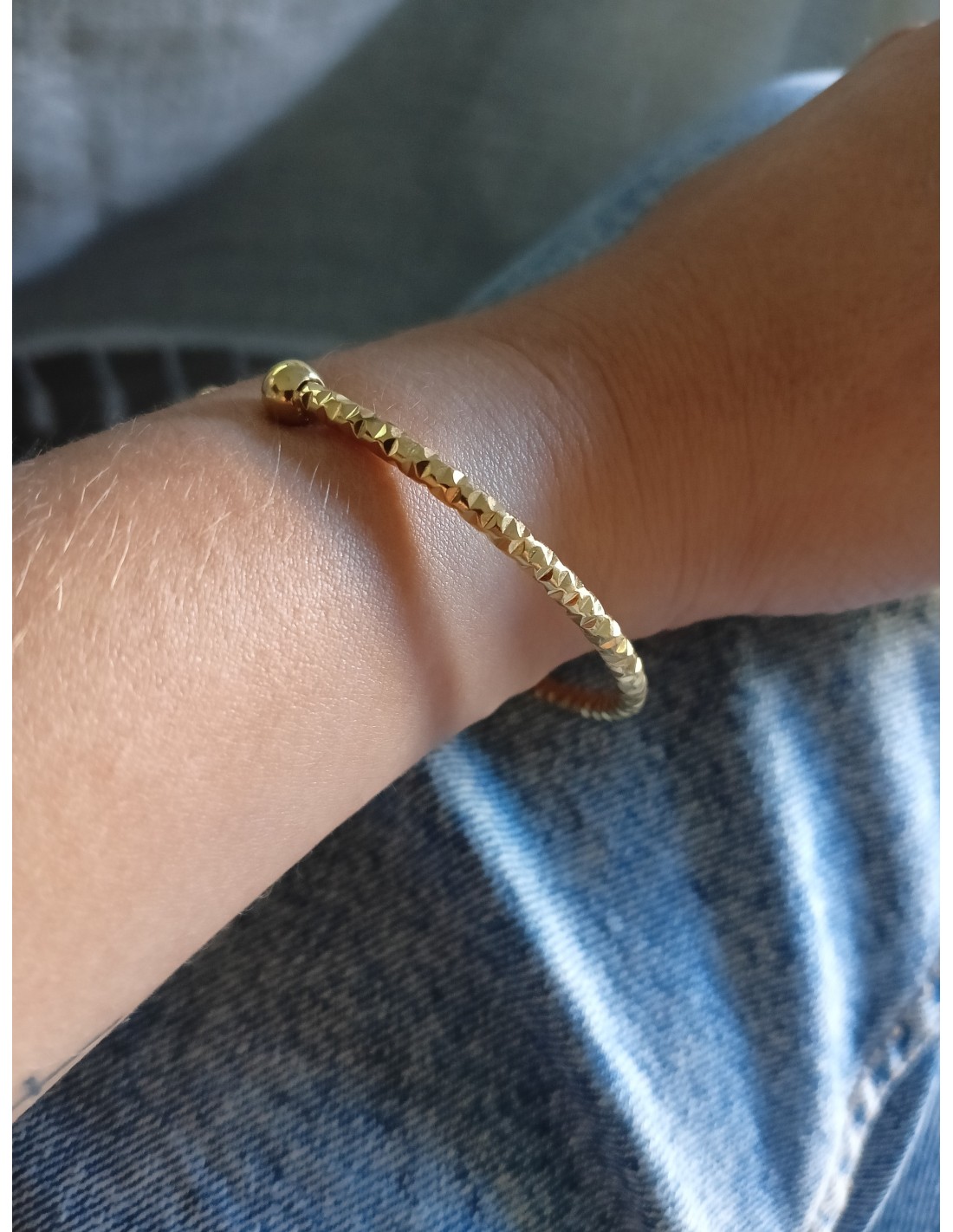 Añade un toque de sofisticación a tu look diario con nuestra pulsera, de diseño facetado que capta la luz con cada movimiento. Su acabado brillante y elegante la convierte en el complemento ideal tanto para ocasiones especiales como para el uso diario.