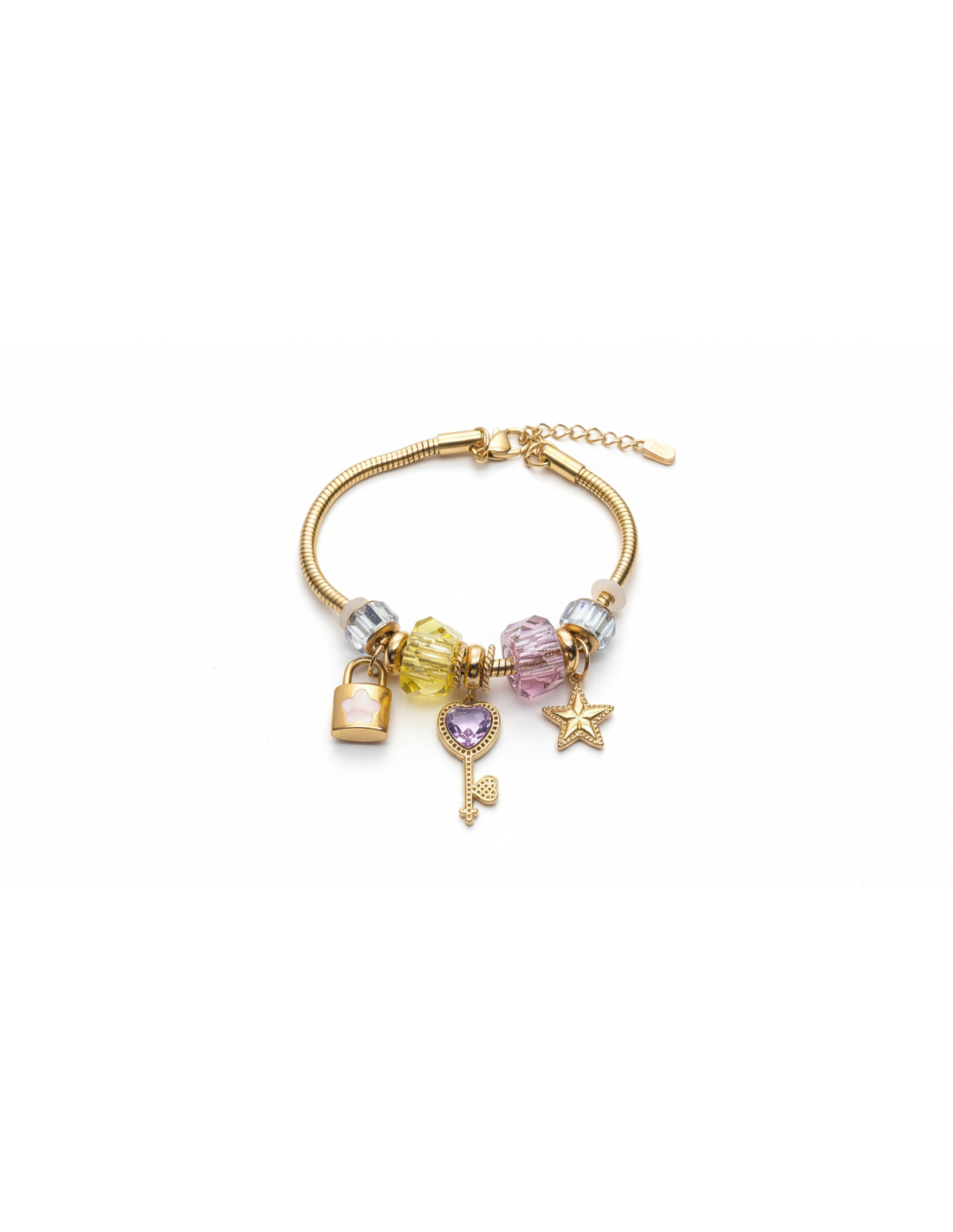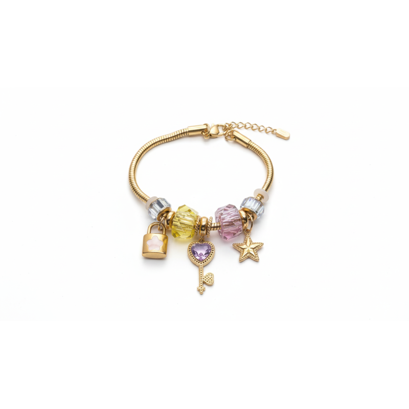 Descubre el encanto y la elegancia con esta pulsera dorada decorada con cristales de colores y charms únicos.