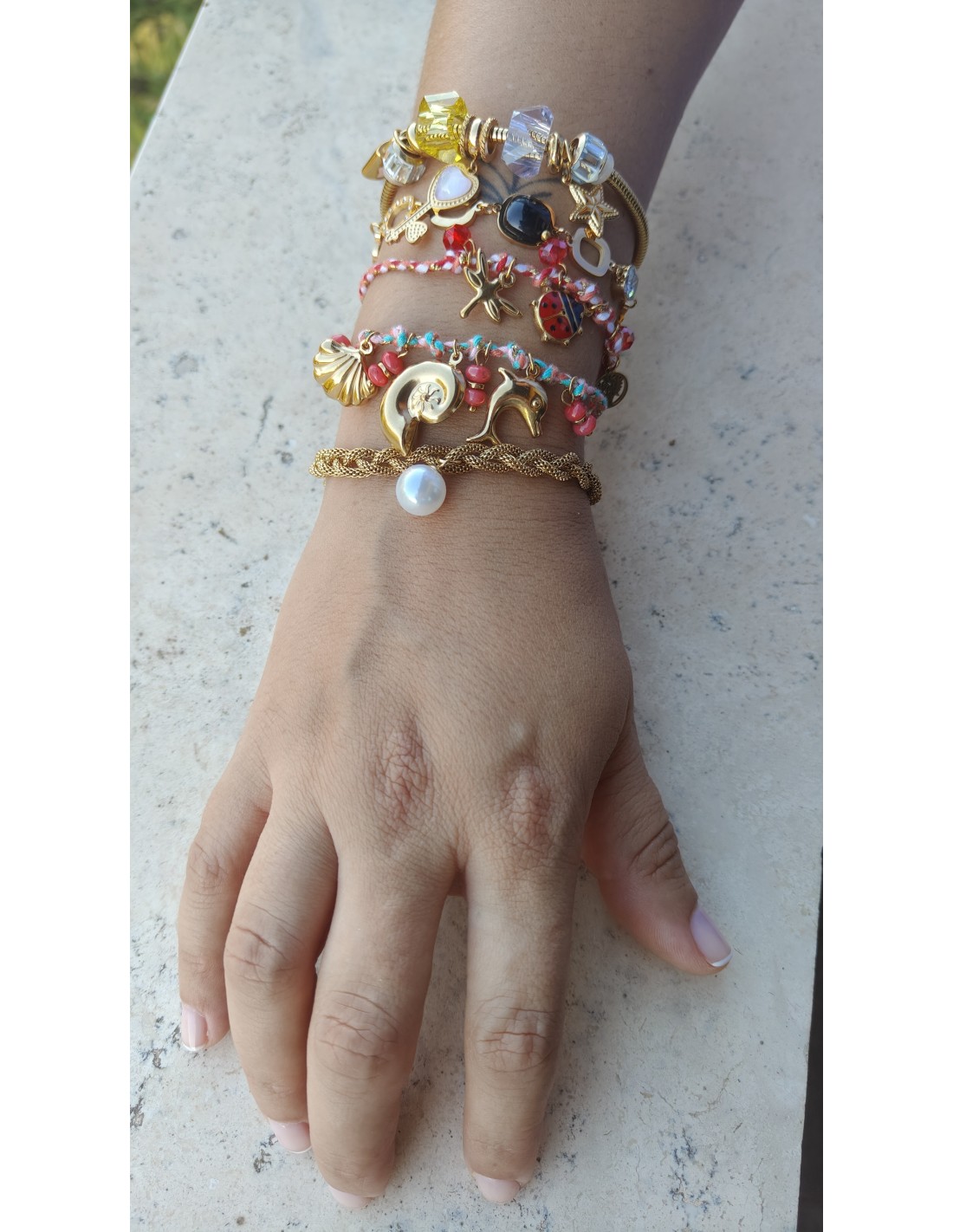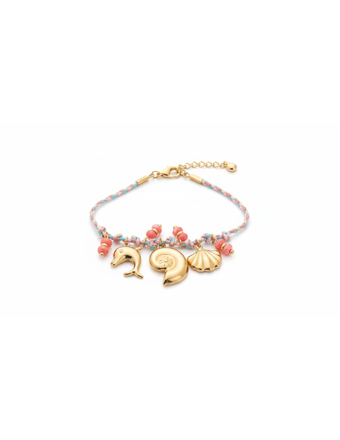 Sumérgete en el encanto del mar con esta preciosa pulsera trenzada artesanal, decorada con colgantes dorados de inspiración marina: un delfín, una concha y un caracol, símbolos de libertad, energía y conexión con la naturaleza.